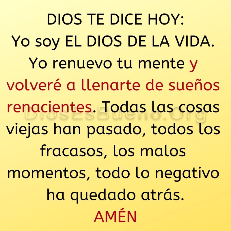 Yo soy  EL DIOS DE LA VIDA. Yo renuevo tu mente y volveré a llenarte de sueños renacientes. Todas las cosas viejas han pasado, todos los fracasos, los malos momentos, todo lo negativo ha quedado atrás.