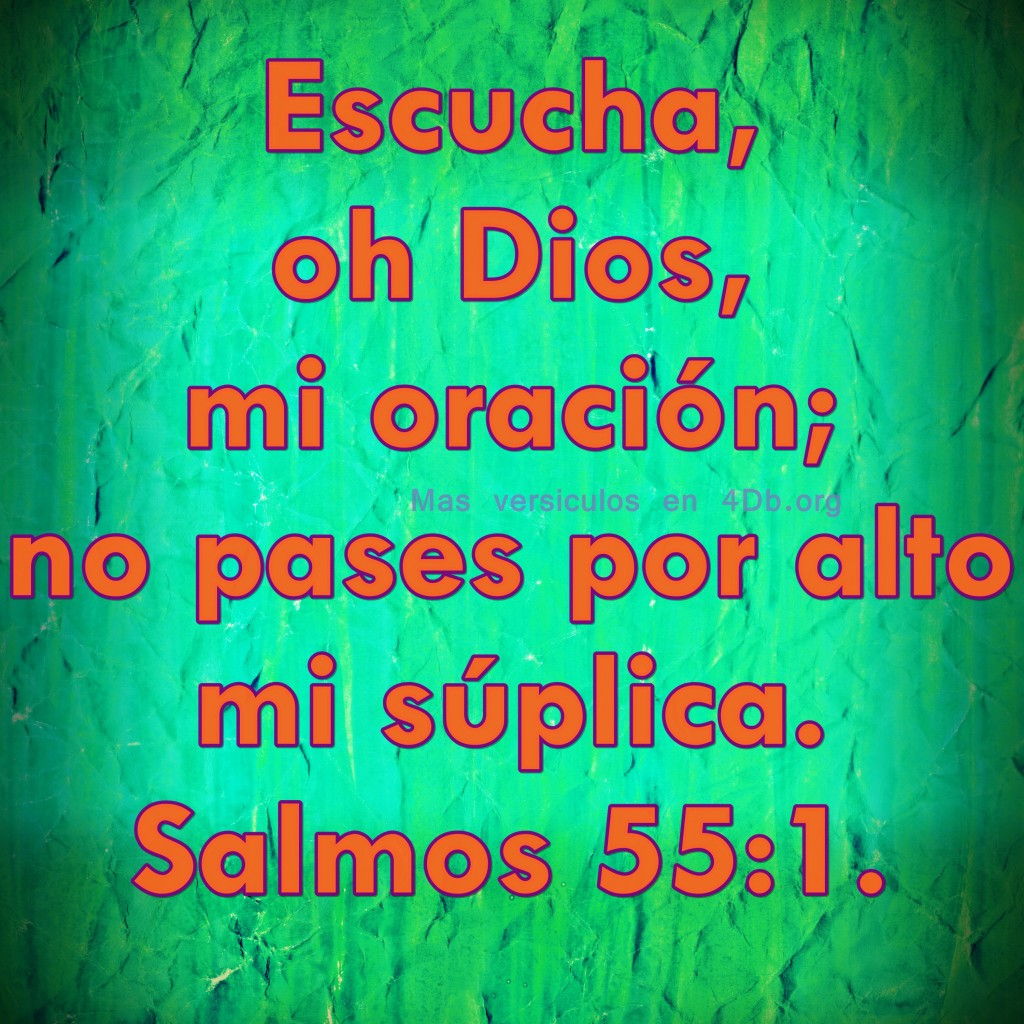 Salmos 55:1 Palabras Que Fortalecen Imagenes de Dios Es Bueno Para compartir en Facebook Dios Es Bueno hace 13 años Escucha, oh Dios, mi oración, Y no te escondas de mi súplica. Salmos 55:1 (Reina-Valera 1960)