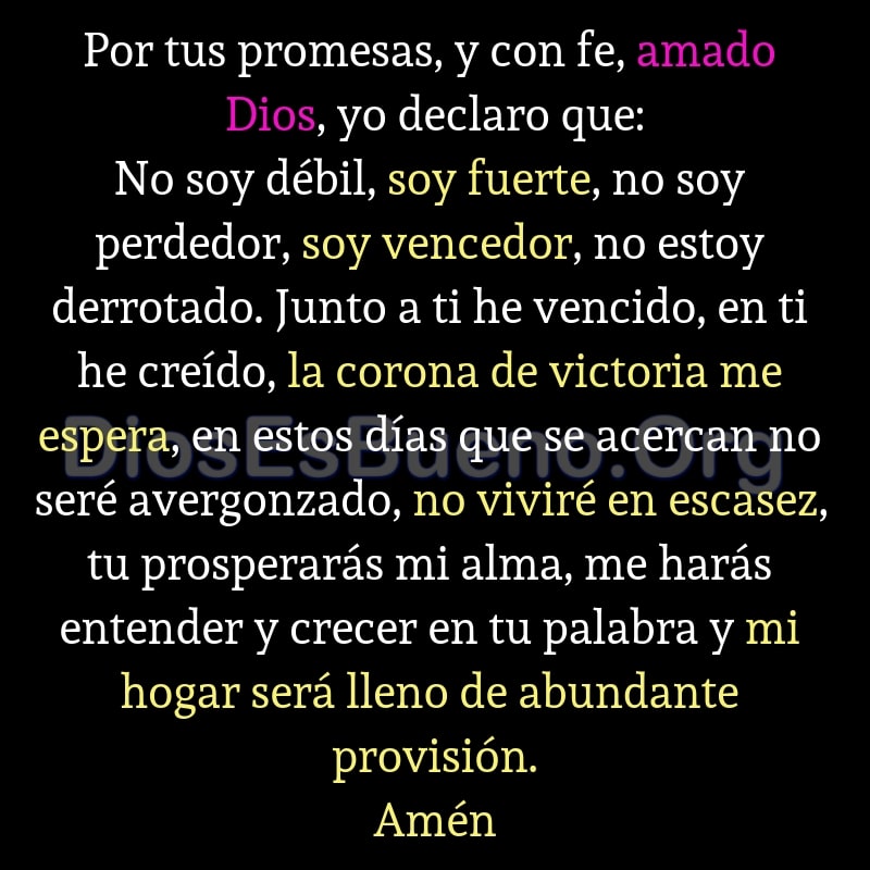 No soy débil, soy fuerte, no soy perdedor, soy vencedor, no estoy derrotado. Junto a ti he vencido, en ti he creído, la corona de victoria me espera, en estos días que se acercan no seré avergonzado, no viviré en escasez, tu prosperarás mi alma, me harás entender y crecer en tu palabra y mi hogar será lleno de abundante provisión.
